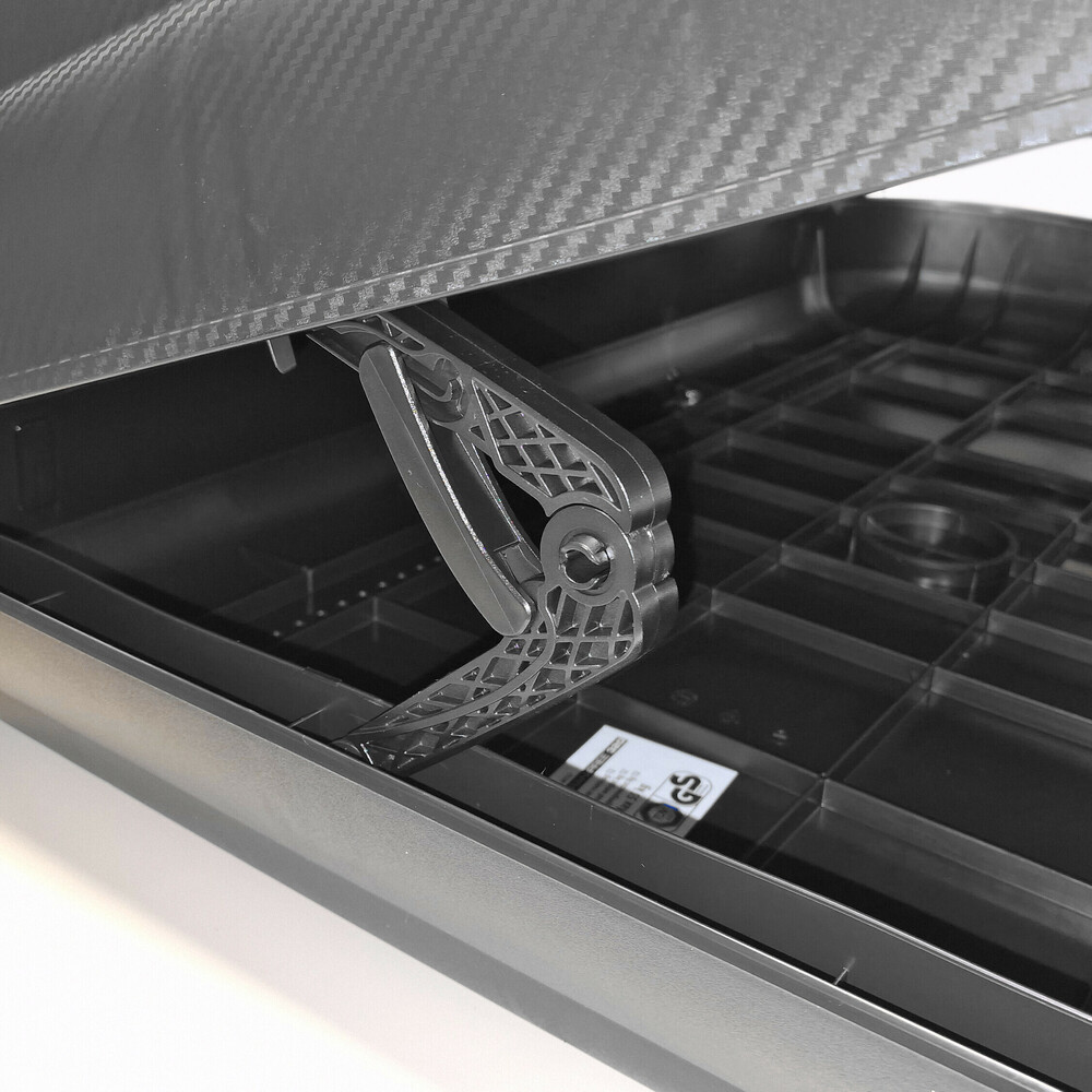 Grand-Prix, polypropylene roof boxes The result of the study both of aerodynamic impact and internal spaces is implemented by sport and elegant design with a carbon look. Universal for most vehicles. Easy and fast to assembly. Produced in polypropylene, shock proof material, water proof and resistent against solvents and oils. Produced with recycling and recyclable plastic, in compliance with REACH regulation.
